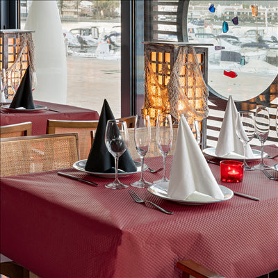 En situation réelle, vous utilisez ces nappes pour habiller rapidement une salle de restaurant, un buffet ou un événement traiteur tout en gardant une marge de manœuvre sur la découpe. Vous déroulez simplement la longueur souhaitée, coupez, puis ajustez l’installation table par table. C’est particulièrement pratique pour les grandes tablées ou les configurations qui changent souvent. La teinte bordeaux apporte une ambiance chaleureuse pour des services du soir, banquets ou réceptions, tout en restant adaptée au contact direct avec les aliments grâce à ses certifications.
