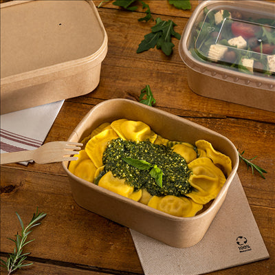 Cette barquette est conçue justement pour gérer sans souci les préparations chaudes, froides, humides ou grasses. Le carton est en kraft avec une couche interne de PE, ce qui évite que les sauces ou les graisses ne traversent et ne tâchent l’extérieur. Vous pouvez donc y mettre des plats en sauce, des salades assaisonnées ou des préparations plus grasses en toute tranquillité. Le couvercle en plastique, vendu séparément, se clipse facilement et assure une bonne tenue pour le transport. Vous avez ainsi un vrai contenant fiable pour la vente à emporter.