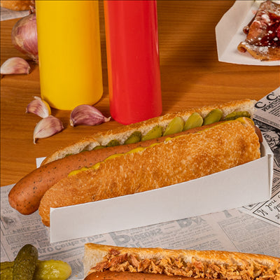 En situation réelle, ces boîtes sandwich sont idéales pour le service de hot-dogs en vente à emporter, livraison ou restauration sur place type snack. Vous pouvez y placer directement le hot-dog chaud dès la sortie du grill, la structure nano-micro apportant rigidité et tenue en main, même avec des garnitures généreuses. Elles conviennent très bien aux stands événementiels, aux food trucks ou aux kiosques en gare, où il faut servir vite tout en restant propre. Vous offrez ainsi à vos clients une expérience pratique, confortable à manipuler et cohérente avec une démarche responsable.
