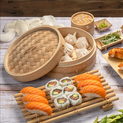 Le Dim-Sum est un repas cantonais fait de petits pains cuisinés à la vapeur dans lesquels se combinent viandes, végétaux, fruits de mer et fruits. De cette façon différentes assiettes se marient avec de multiples et différents ingrédients sans avoir recours à la friture. Ce récipient fabriqué en bambou tressé est composé d'une base et couvercle, permettant d'élaborer et servir des délicieux dimsum, dumplings et pains faits à la vapeur, comme le baozi, qui est servi avec différentes garnitures. Ces récipients offrent un style naturel et traditionnel permettant de partager et profiter d'une multitude d'assiettes orientales, en plus d'être la meilleure manière de maintenir l'aliment chaud. Le couvercle en forme de dôme permet la circulation de la vapeur pour une cuisson égale et rapide. Poids par unité : 120g Certifications : Biodégradable, Apte au contact alimentaire., ISO 9001, Registre Sanitaire des Entreprises Alimentaires, Bonnes pratiques de fabrication