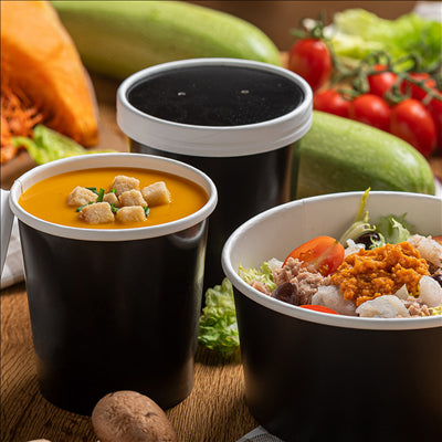 Ce modèle est parfaitement adapté pour servir des préparations très chaudes comme des soupes ou des ramen. Les bols soupe sont en carton double paroi, ce qui crée une barrière isolante efficace pour garder la chaleur tout en protégeant vos mains des brûlures. Les deux faces sont dotées d’une fine couche de PE, compatible avec le contact alimentaire et idéale pour les aliments liquides. Le couvercle percé laisse s’échapper la vapeur, ce qui évite la condensation excessive. Vous obtenez ainsi un conditionnement sûr, confortable à manipuler et conforme aux exigences d’hygiène professionnelle.