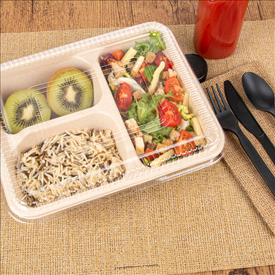 En situation réelle, ces plateaux repas sont parfaits pour la vente à emporter ou la livraison de menus complets. Vous pouvez y présenter un plat principal, un accompagnement et un dessert ou une garniture, sans mélange de saveurs grâce aux trois compartiments séparés. Le couvercle limite les fuites et facilite la manutention lors du transport. Si vous gérez un service de restauration rapide, de traiteur ou de repas d’entreprise, vous y gagnez en praticité et en présentation, tout en proposant une solution alignée avec une démarche plus responsable.