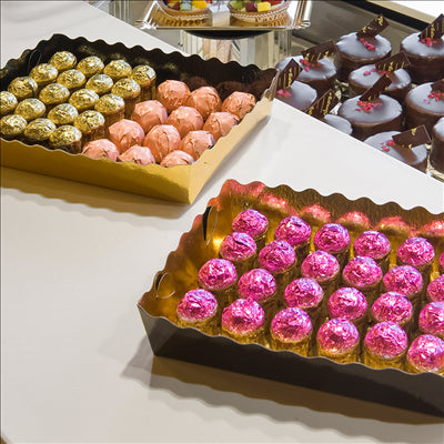 Comment utiliser au mieux des barquettes pâtisserie carton or noir luxe 22x14 en vitrine ?