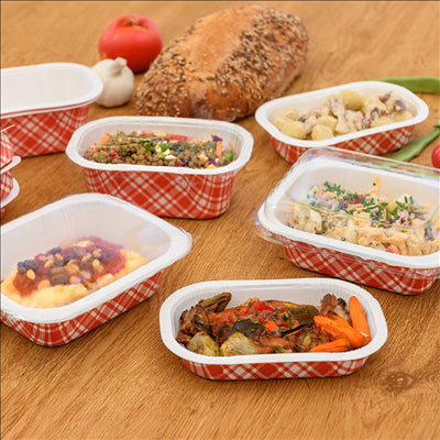 BARQUETTES THERMOSCELLABLES Les produits conçus pour le transport de plats préparés sont prêts à emporter puisque le système de thermo-scellage permet de fermer hermétiquement et prévient ainsi contre les déversements et la perte de nourriture. Température de scellage 150°C–200°C. Résistent aux températures élevées et sont adaptés au four traditionnel et au micro-ondes. Décor Vichy tendance. Poids par unité : 8g390 G/M2 + 25G/M2 Certifications : Matériau en plastique apte au contact alimentaire., Biodégradable, Apte au contact alimentaire., ISO 9001, Registre Sanitaire des Entreprises Alimentaires, Bonnes pratiques de fabrication
