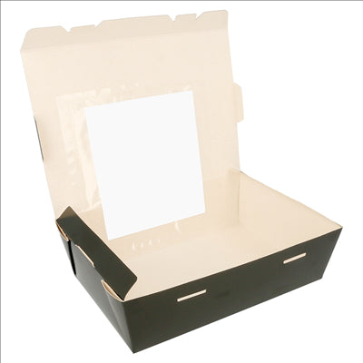 Quelle capacité et quelles dimensions offrent ces boîtes repas américaines avec fenêtre 1350 ml carton noir ?