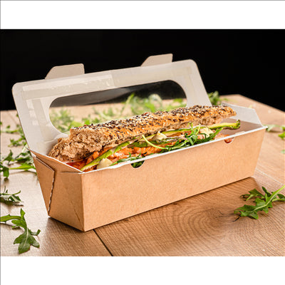 Au quotidien, ces boîtes sandwich s’intègrent très bien dans une organisation de restauration rapide, sandwicherie ou traiteur. Vous pouvez y glisser vos baguettes garnies déjà préparées, la fenêtre offrant une excellente visibilité pour la vente en vitrine ou en comptoir. La fenêtre OPP est facile à retirer si vous devez adapter la présentation ou trier les matériaux après usage. C’est particulièrement utile pour les services à emporter ou la livraison de plateaux déjeuner, où l’identification rapide du contenu fait gagner du temps à vos équipes comme à vos clients.