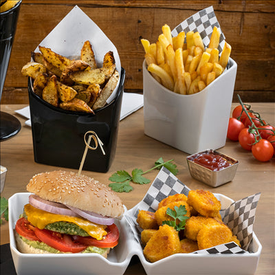 Ce papier emballage peut s'utiliser comme base pour des corbeilles repas ou d'autres récipients qui contiennent des fritures et apéritifs. Idéal pour présenter des frites, ailerons de poulet, nuggets, tempuras, croquettes, calamars à la Romaine et beaucoup d'autres. Personnalisez vos produits avec les styles Fitipaldi, Times, Feel Green ou Parole, que ce soit en blanc ou kraft. Papier emballage ingraissable qui évite les taches et gouttes des huiles et graisses. Il peut être utilisé comme emballage des hamburgers, sandwiches, kebabs, hot dogs, burritos et d'autres repas fast food de taille grande. Même si c'est un produit à usage unique, il garantit une réduction des résidus grâce à qu'ils occupent moins d'espace. Le papier est plus soutenable et moins nocif pour l'environnement que les récipients en plastique. Des encres compostables sont utilisées pour sauvegarder l'environnement. Pour le contact avec les aliments, utiliser la face non imprimée. Certifications : Biodégradable, Encre compostable, Apte au contact alimentaire., ISO 9001, Registre Sanitaire des Entreprises Alimentaires, Bonnes pratiques de fabrication, Sans PFOS - PFOA