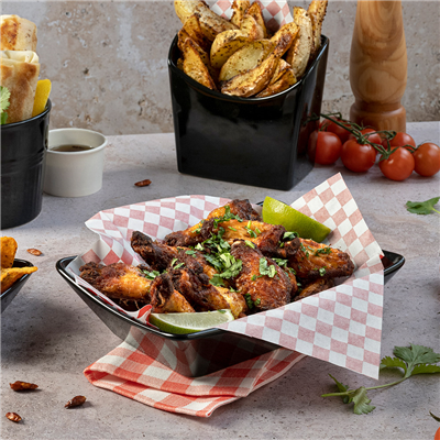 Ce papier emballage peut s'utiliser comme base pour des corbeilles repas ou d'autres récipients qui contiennent des fritures et apéritifs. Idéal pour présenter des frites, ailerons de poulet, nuggets, tempuras, croquettes, calamars à la Romaine et beaucoup d'autres. Personnalisez vos produits avec les styles Fitipaldi, Times, Feel Green ou Parole, que ce soit en blanc ou kraft. Papier emballage ingraissable qui évite les taches et gouttes des huiles et graisses. Il peut être utilisé comme emballage des hamburgers, sandwiches, kebabs, hot dogs, burritos et d'autres repas fast food de taille grande. Même si c'est un produit à usage unique, il garantit une réduction des résidus grâce à qu'ils occupent moins d'espace. Le papier est plus soutenable et moins nocif pour l'environnement que les récipients en plastique. Des encres compostables sont utilisées pour sauvegarder l'environnement. Pour le contact avec les aliments, utiliser la face non imprimée. Certifications : Biodégradable, Encre compostable, Apte au contact alimentaire., ISO 9001, Registre Sanitaire des Entreprises Alimentaires, Bonnes pratiques de fabrication, Sans PFOS - PFOA