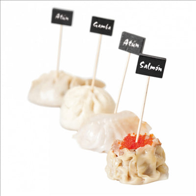 L’avantage principal, c’est que vous disposez d’un conditionnement pensé pour un usage régulier en restauration : 100 unités par lot. Chaque pique mesure environ 9 cm de hauteur, avec une zone ardoise d’environ 3,5 x 2,5 cm, ce qui laisse suffisamment de place pour noter clairement « bien cuit », « à point » ou toute autre mention utile. Vous y gagnez en lisibilité pour vos équipes et vos clients, tout en optimisant vos coûts par portion. Ce format est pratique pour les assiettes de viandes, plateaux ou buffets où chaque détail compte.
