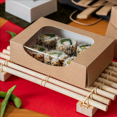 Quelles dimensions et quel conditionnement pour ces boîtes repas sushi avec fenêtre carton nano-micro ?