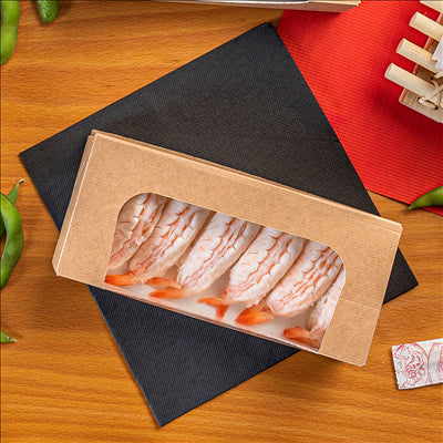 Au quotidien, vous pouvez exploiter ces boîtes sushi pour mettre en valeur vos assortiments tout en gardant une belle visibilité grâce à la fenêtre transparente. La fenêtre en OPP se retire facilement si vous souhaitez adapter la présentation ou favoriser davantage l’isolation. Ce modèle convient parfaitement aux prestations à emporter, vitrines réfrigérées ou buffets où l’on doit voir le produit sans l’ouvrir. La rigidité apportée par la nano-micro ondulation limite les déformations pendant le transport. Vous y placez vos sushis, makis ou autres préparations froides, en gardant une présentation propre et professionnelle.