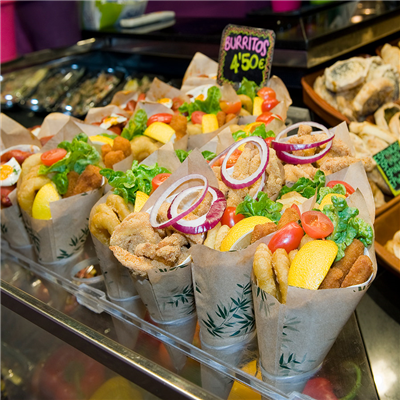 En situation réelle, ces barquettes frites sont pensées pour la vente à emporter de snacks comme frites, churros ou poisson. Le format en pointe tient bien en main, facilite la dégustation nomade et s’adapte aux stands, food trucks ou points de vente de rue. Le papier ingraissable évite les coulures dans les sacs, ce qui améliore l’expérience de vos clients en déplacement. Vous pouvez aussi choisir différents designs (style journal américain, gamme Feel Green, motif Chips) pour coller au positionnement visuel de votre établissement.