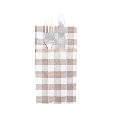Au quotidien, vous allez surtout apprécier la praticité d’usage de ces serviettes. Elles arrivent déjà pliées en forme de pochette, prêtes à accueillir couteau, fourchette et cuillère, ce qui accélère énormément la mise en place. Vous préparez vos couverts en amont, puis vous posez simplement chaque serviette sur la table ou sur un plateau de room-service. Le motif vichy taupe apporte une touche élégante sans être trop formelle, parfait pour une terrasse d’hôtel ou de restaurant cherchant une ambiance chaleureuse, soignée et cohérente avec une démarche écoresponsable.